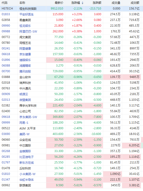 恒生科技指数跌2% 小米跌5%美团跌3%