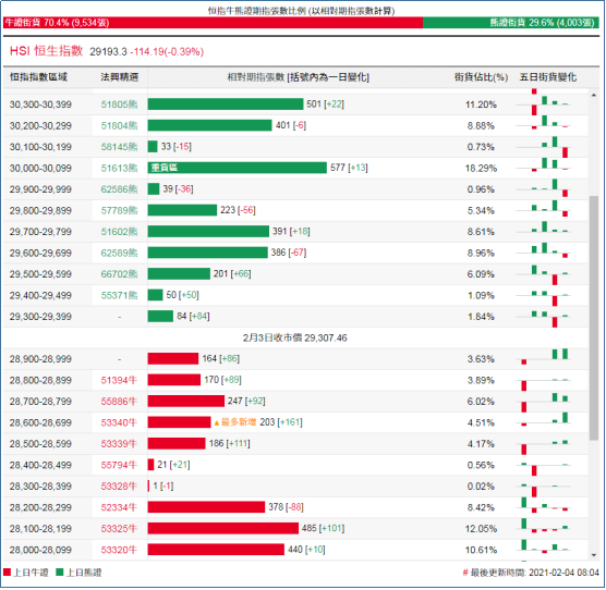 街货分布方面,至周三,恒指牛证街货主要在收回价28500点至29000点之间,贴价街货量累计相当约656张期指合约;恒指熊证街货在收回价29300点至29800点之间,相当约1112张期指合约。