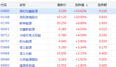 在港上市光伏概念股大涨,洛阳玻璃股份(1108.HK)涨10%再创新高,保利协鑫能源(3800.HK)涨10%。