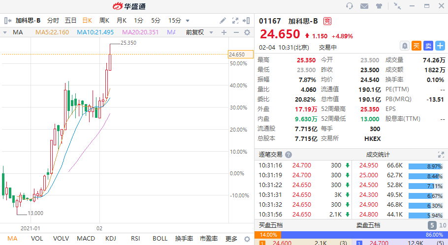华盛资讯2月4日讯,加科思-B今日再创新高,盘中一度涨超5%,最高见25.35港元。截至发稿,加科思-B上涨4.89%,现报24.65港元,成交额1822万港元,当前总市值为190.1亿港元。自上市已累计上涨78%。