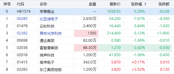 华盛资讯2月4日消息,苹果概念股午后跌幅扩大逾5%,截至发稿,比亚迪电子跌超7%,丘钛科技、舜宇光学科技跌超5%,富智康集团跌超2%,瑞声科技跌超1%。