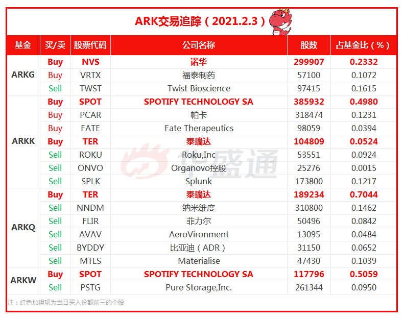 大笔抄底Spotify!ARKK、ARKW合计买入Spotify超50万股,斥资约1.6亿美元。该股昨日盘前发布Q4财报,上季度订阅增长27%超预期,但全年每股亏损同比扩大逾2倍,昨夜收盘跌超8%