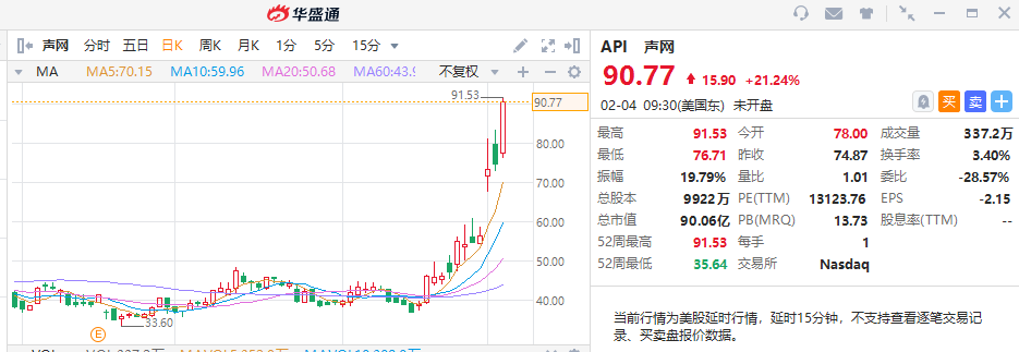在近三个星期的时间里,声网的股价从37美元暴涨至最高91.53美元,区间最大涨幅超过147%!