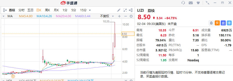 从华盛通APP上,我们可以看到荔枝的股价1月29日收市还仅为3.3美元,3个交易日的时间荔枝一度股价涨至历史新高的10.35美元。按照2月3日收市价8.5美元计算,短短3个交易日时间荔枝暴涨幅度达158%。