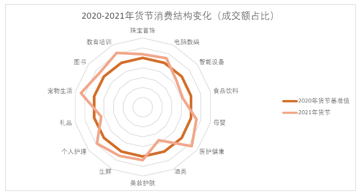 “原地过年”也拉起了很多“新”品类的消费,对比去年年货节期间的消费结构可见,消费者今年除了在医护健康类的支出持续增长外,在宠物生活、母婴、个人护理和教育培训+图书等品类方面的消费占比增长较大。