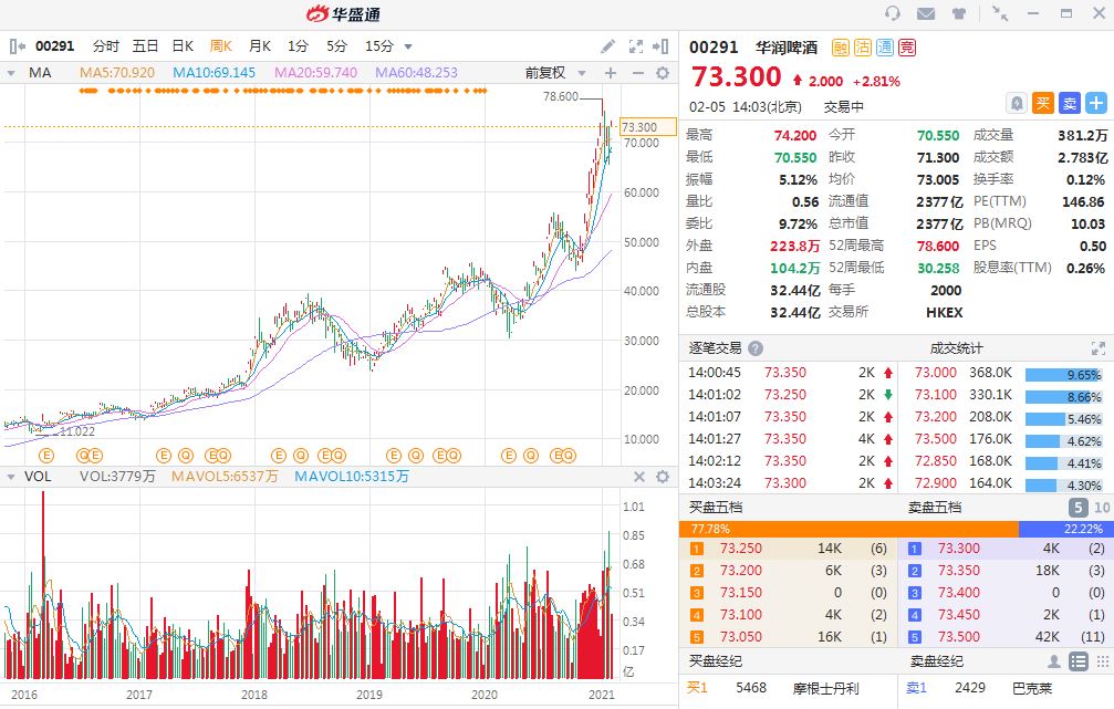 华润啤酒本身也是只超级大牛股,近10年以来股价从2010年低点不到10元,涨至现在70多元,让人叹为观止。