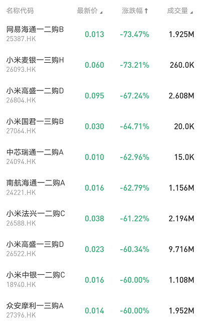 在今日跌幅榜中,网易海通一二购B(25387)跌73.47%;小米麦银一三购H(26093)大跌73.21%。