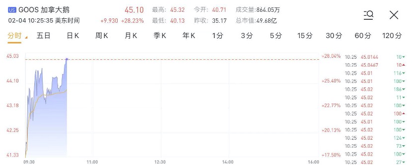 截至发稿,加拿大鹅大涨28.23%,现报45.1美元,当前总市值约50亿美元。