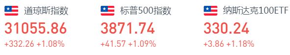 周四道指涨332.26点,或1.08%,报31055.86点;纳指涨167.20点,或1.23%,报13777.74点;标普500指数涨41.57点,或1.09%,报3871.74点。