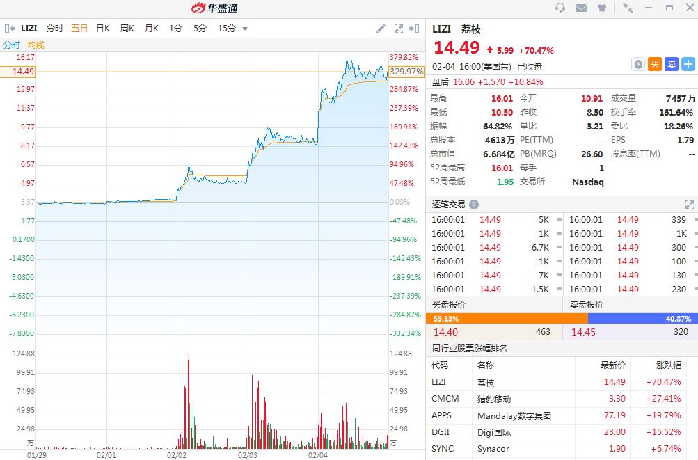 短视频概念股荔枝周四暴涨70%,股价创历史新高,该股本周已累计上涨超过330%。