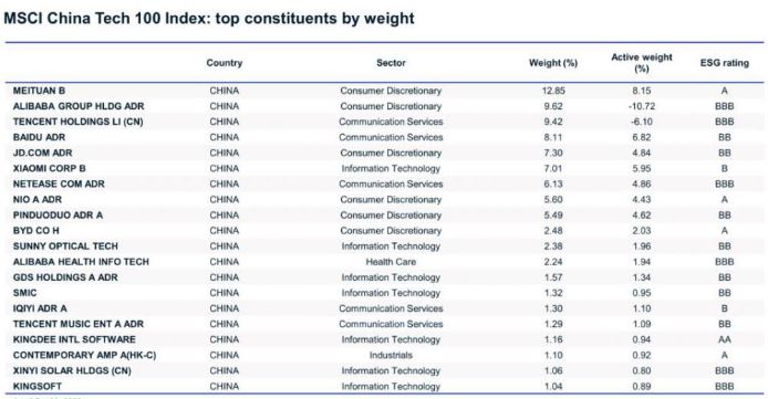MSCI明晟公司2月4日正式推出MSCI中国科技100指数以及中国A股在岸科技100指数,以满足境内外投资者对中国领先的科技及创新型经济企业的投资需求。从具体成份股来看,美团、阿里、腾讯的权重位列指数前三位,美团权重排名第一,为12.85%。