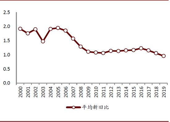 由于二手车周期性波动较小,且毛利率相对较高,二手车在经销商的主力业务中占比也逐渐提高。2004年到2019年,美国经销商的新旧销量比从1.91倍下降到0.96倍,这说明在美国经销商的主营业务中,二手车销量已经超过了新车销量。