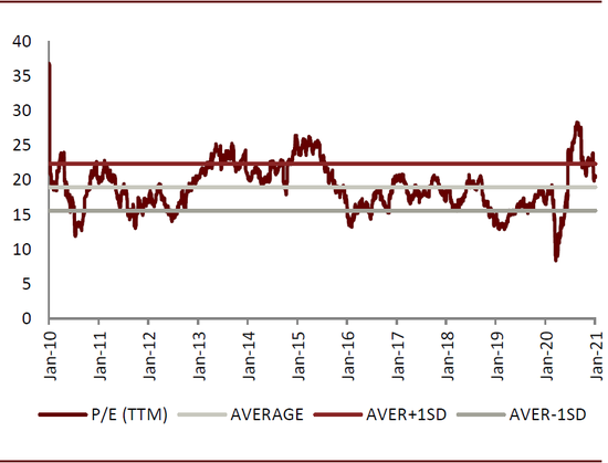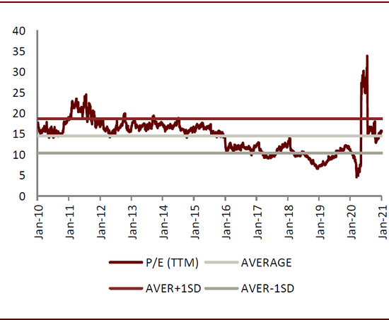 图表: 2010年至今,CarMax平均P/E为19x,波动性更小,估值中枢较为稳定