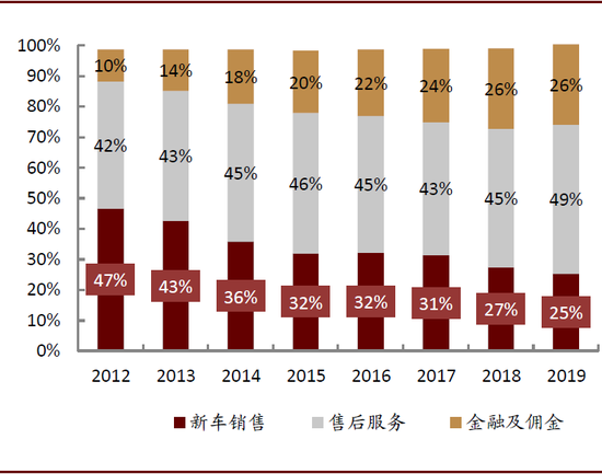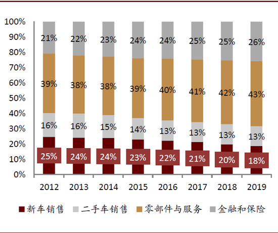 图表: 2004~2019年美国经销商新车和二手车的收入占比