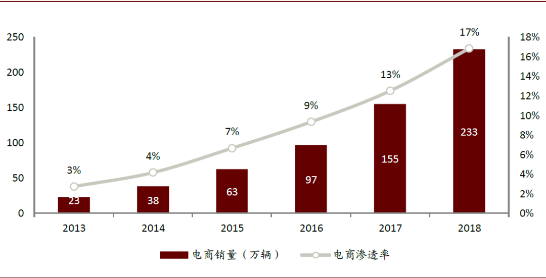 二手车互联网电商平台快速发展,渗透率不断提高。我国的二手车电商平台从2014年起开始迅猛发展,线上的二手车交易量持续增长,同时线上交易的渗透率也显著提高。国内二手车电商渗透率从2013年的2.7%,提高到了2018年的16.8%。未来随着消费者对二手车电商平台认知度的提高和信任度的加深,二手车电商将保持高速发展态势。