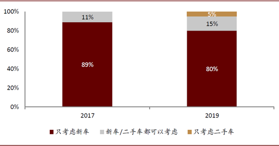国内消费者对二手车的接受度不断提高,是二手车市场发展的根本动力。庞大的二手车市场背后需要消费者需求的强大支撑。据麦肯锡调查显示,2017年在所有购买新车的车主中,仅11%曾考虑过或未来会考虑购买二手车,而这一比例在2019年上升到20%以上。随着收入水平的上升,消费者对二手车的接受度也逐渐增加,高收入群体(家庭月收入在4.8万元以上)中这一比例高达31%。