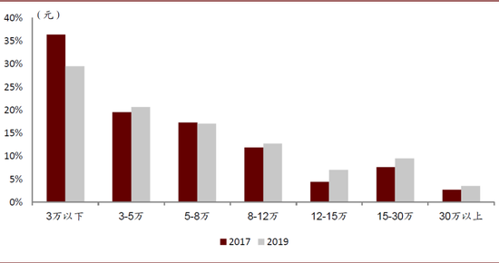 图表: 2017年vs.2019年二手车交易价格区间分布