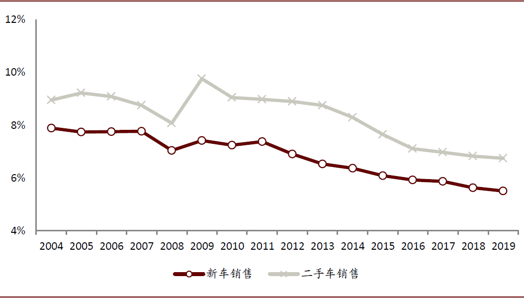 2004~2019年,美国4家经销商上市公司(AutoNation,Lithia,Group1和Penske)的新车销售收入占主营业务收入的比例从60.8%下降8.4ppt到52.4%,相反地,二手车的占比从24.5%上升6.0ppt到30.4%。同时,由于下游市场竞争激烈,新车和二手车的利润空间均被不断压缩,但同时二手车的毛利率始终比新车高1.0到2.3个百分点。