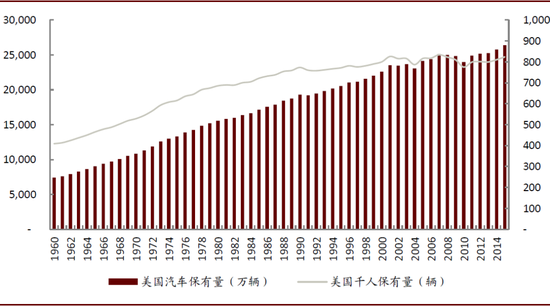 图表: 1960~2015年美国汽车保有量和千人保有量