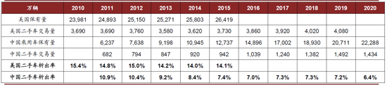我们对比了中美当年二手车交易量占当年保有量的比重,即保有量析出率,中国2020年析出率约6.4%,而美国目前二手车析出率已基本稳定在14%以上。横向对比来看,我国2020年乘用车保有量已达到美国2010年水平,而析出率同美国2010年相比有接近9ppt的差距,有较大保有量更新空间。