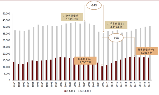 图表: 1990年以来,美国二手车历年销量及经销商的商业模式复盘