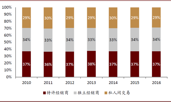 独立二手车商是目前国内二手车的主要渠道,市占率达到82%。独立的二手车商一般为独立的经销商集团,专门销售二手车。目前,我国一半以上的独立经销商仍然是小车商,其盈利来源仍主要是交易佣金收入。由于二手经销企业需要按照2%销售额的增值税率交税,因此会有部分中小经销商为了降低税负,将二手车转给个人“黄牛”进行交易,使得这种交易模式存在一定的法律风险。