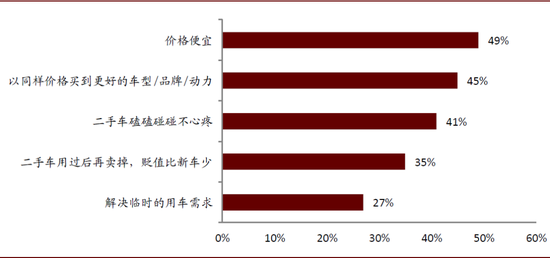 购置成本低、性价比高是选购二手车的主要原因。消费者购买二手车,主要看重价格便宜,二手车一般较新车予以折价,且不用缴纳购置税。而相同预算下,购买二手车可以买到更好的配置、品牌与车型。同时,相比新车,二手车磕碰起来不心疼,女性受访者尤其看重这一点。