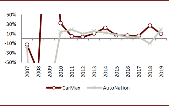 图表: 2007年至今CarMax与AutoNation的营收增速