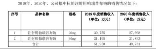 据上海阳光采购网公布的拟中选结果显示,帕瑞昔布注射剂共有10家企业拟中选,中标价为2-6元/瓶不等,峨眉山通惠制药报价最低,为2.98元。科伦为该品种国内首仿,于2020年11月才通过一致性评价,科伦40mg报价5.64元,以第9顺位压线中选,供应区域为湖南、宁夏、新疆(含兵团) 。据科伦公告显示,其拟中标的帕瑞昔布注射剂(20mg+40mg )2019年销售收入51950万元,2020年销售额为49781万元。