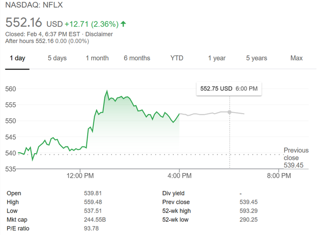 受到日本涨价新闻的刺激,在周四的交易中,Netflix股价在盘中攀升最多3.7%。到周四收盘时(北京时间周五5点),Netflix股价收于552.16美元,上涨2.36%。