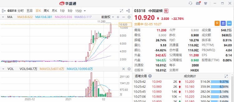 中国波顿急升逾22%,年内累涨超500%