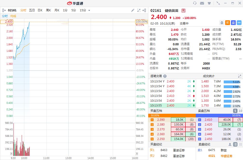 健倍苗苗今日首挂高开23.33%,随后股价不断走高,目前涨100%。
