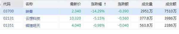 截至发稿,映客跌14.29%,报2.34港元,云想科技跌5.15%,报10.32港元,辉煌明天跌0.98%,报4.04港元。