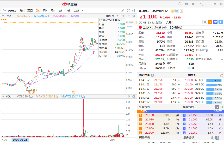 JS环球生活(1691.HK)近日再起升势,5日连涨20%。现升8%,高见21.35港元再创历史高价,总市值超730亿港元。