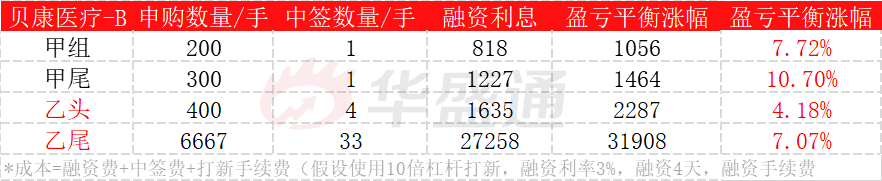 甲尾融资打新300手,按中签一手为例,利息1227港元,盈亏平衡点10.7%;
