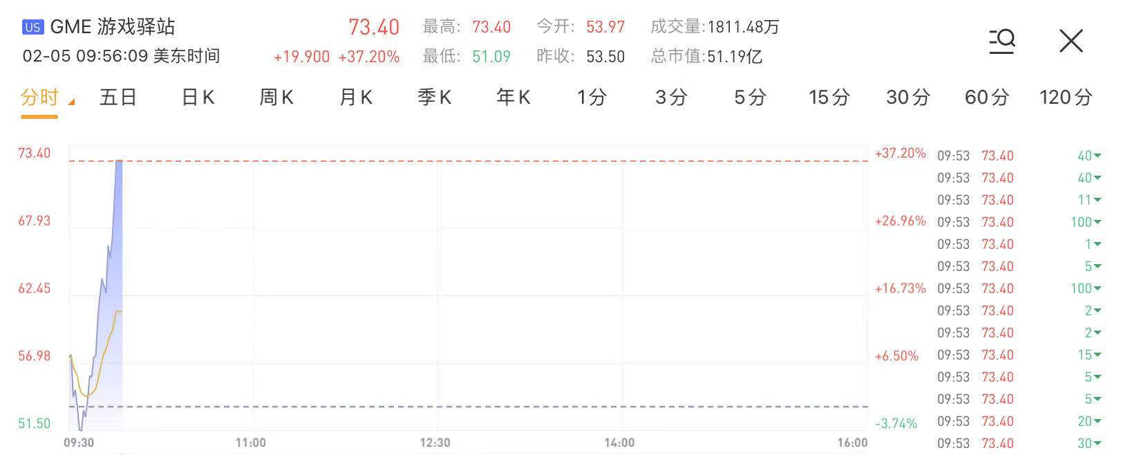 华盛资讯2月3日讯,游戏驿站(GME)涨近40%。截至发稿,GME涨37.20%,现报73.4美元,当前总市值约50亿美元。
