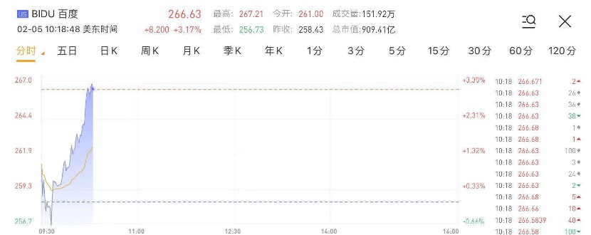华盛资讯2月3日讯,截至发稿,百度盘中涨3.17%,现报266.63美元,当前总市值约909亿美元。此前,百度关联公司公开多项自动驾驶相关专利。