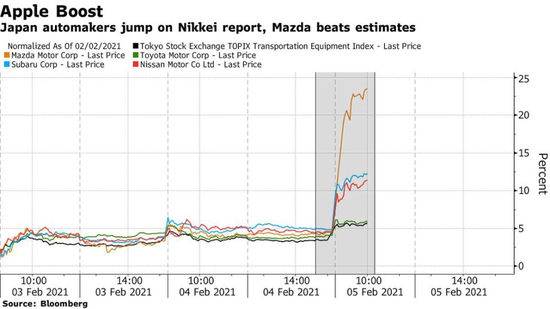 传出苹果考虑和日本企业共同开发汽车的消息当天,本周五三大日本汽车厂商股价全线上扬。日产日股收涨超7%,丰田日股涨超2%,财报业绩优于预期的马自达更是大涨逾18%。斯巴鲁日股收跌0.21%,但盘中曾涨近10%。