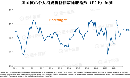 Russel Investments对此表示认同,并认为持续的通胀压力最早也要到2022年才会出现。Russel Investments得出这一观点的原因是,他们的模型显示美国核心个人消费价格指数通胀指标(PCE)预期到今年年底将触及1.8%,该指标是美联储通常使用的衡量通胀的指标。