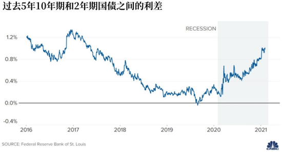 美国国债收益率曲线作为债券市场上的重要指标广受关注,显示了短期和长期利率之间的差异,目前处于2017年5月以来的最高水平。2年期美债收益率,目前为0.11%附近,10年期收益率为1.14%,利差为1.03%,随着10年期收益率的上升而小幅上升。