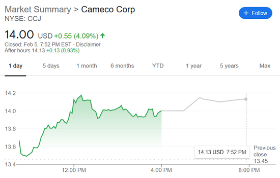 本周五,在没有基本面推动的情况下,全球最大的铀矿生产商Cameco股价上涨4%,今年第二次站上14美元。