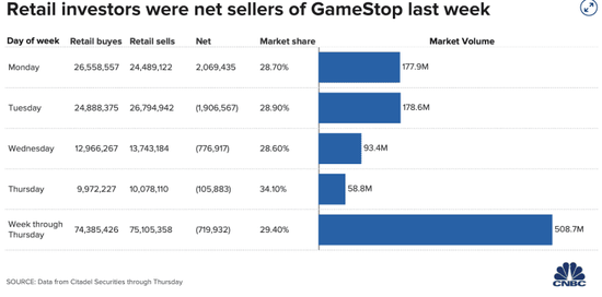Citadel Securities的数据显示,从上周二到上周四,散户投资者实际上是GameStop的净卖家。