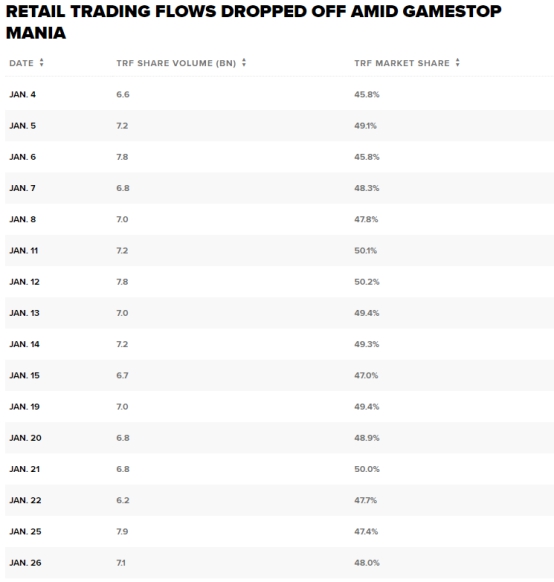 零售交易量在上周二达到50%,接近历史最高水平,但第二天下跌超过5%,这表明,个人投资在Reddit热潮最激烈的地方减少了。