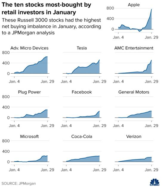 摩根大通的量化基金团队使用来自交易所的公开数据,并应用专有方法来识别哪些流动来自散户。GameStop在该公司1月份的零售购买名单上排名第15位。