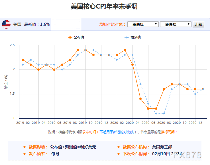 ,由于近期油价等大宗商品上周,市场预计美国1月季调后CPI环比将增长0.4%;不过预计核心CPI年率仍将低于2%,预计同比增长1.5%,前值为1.6%。