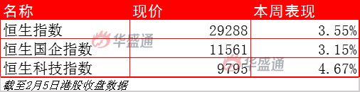 恒生指数周涨3.55%,报29288;恒生科技指数周涨4.67%,报9795;国企指数周涨3.15%,报11561。