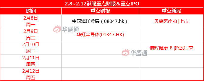 华虹半导体将于下周二发布财报,贝康医疗-B下周一上市,诺辉健康-B下周三结束招股。