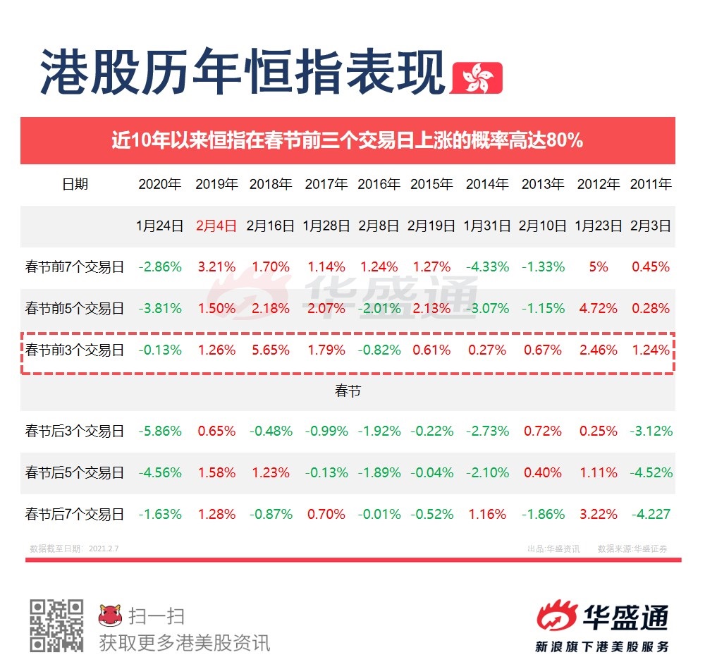 据华盛通数据统计发现,2011年以来在春节前三个交易日中,恒生指数上涨概率为80%,平均涨幅2.26%。但值得注意的是,2016年春节期间是由于A股的熔断导致港股的同步下挫,而2020年则是受到新冠疫情的影响而引发股市暴跌。如果排除这两次“意外事故”,2011年以来恒指在春节前三个交易日上涨的概率高达100%。