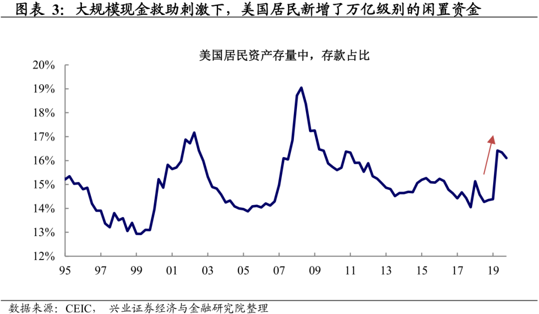 在大规模刺激下,美国居民约拥有1.7-2.2万亿的闲置资金。美国政府不断“发钱”使得2020年美国居民存款占比高于正常水平。据我们估算,美国居民约拥有1.7-2.2万亿的闲置资金,约占美股市值的3%-4%。
