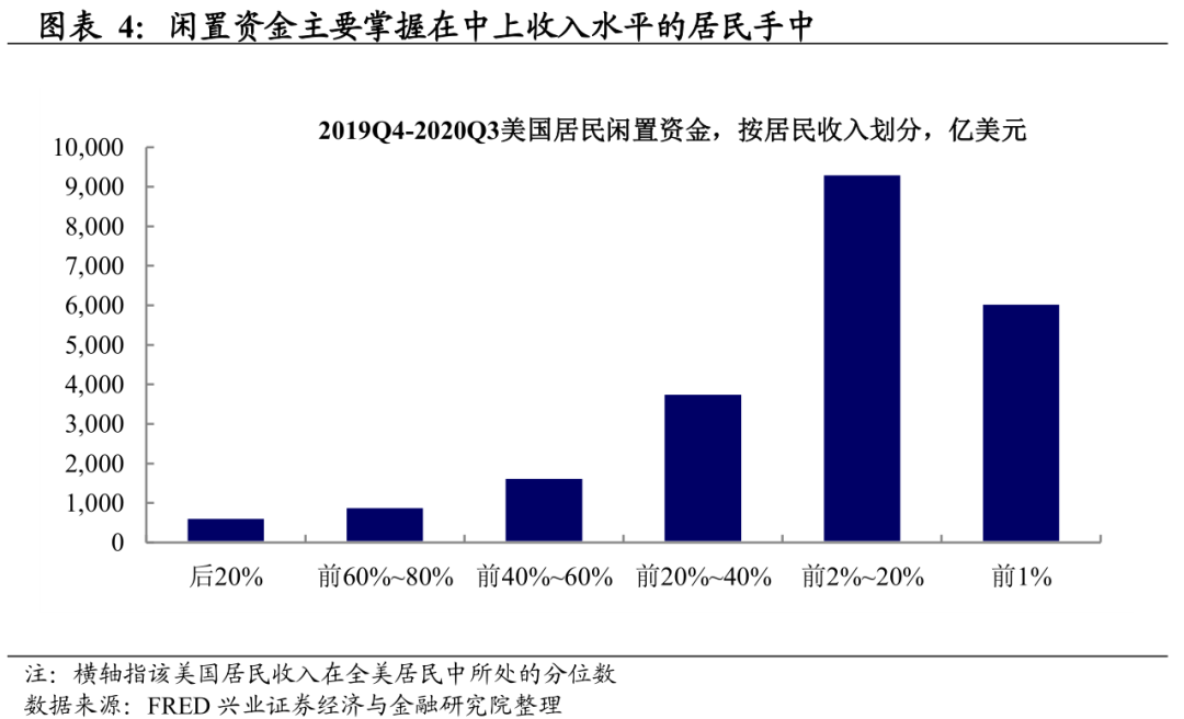 但闲置资金并非均匀分布,主要掌握在收入前40%的人手中。虽然此轮宽松政策相较于2009年的量化宽松政策更加注重对低收入人群的补助,但从目前而言,拥有闲置资金最多的人群并非低收入人群,而是收入在前40%的中上阶层人群。
